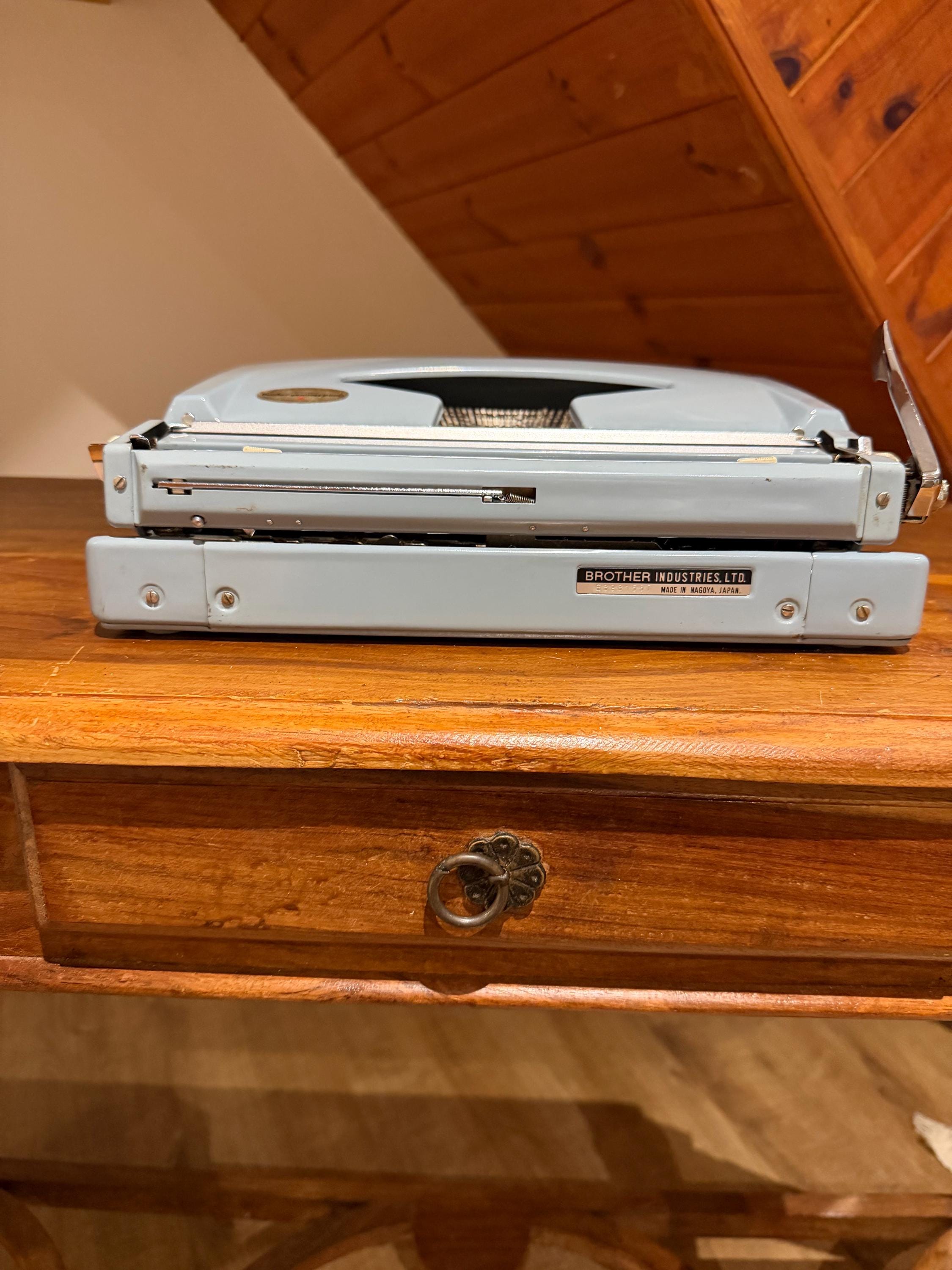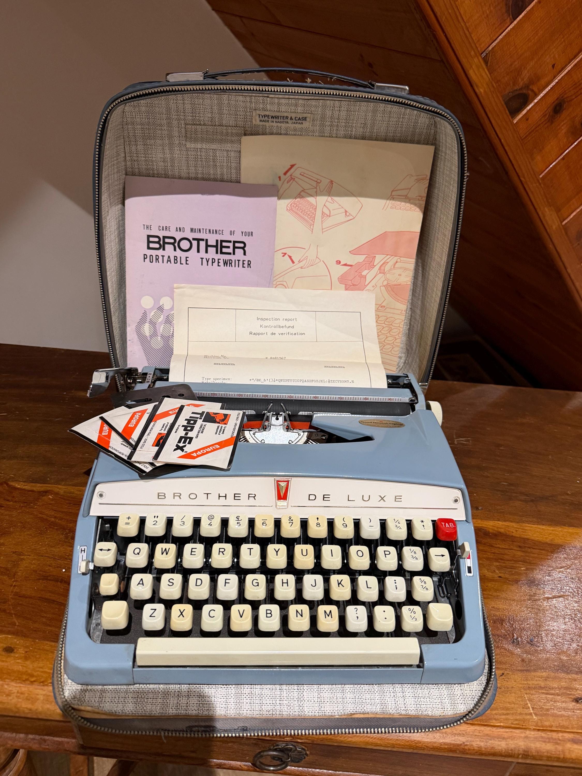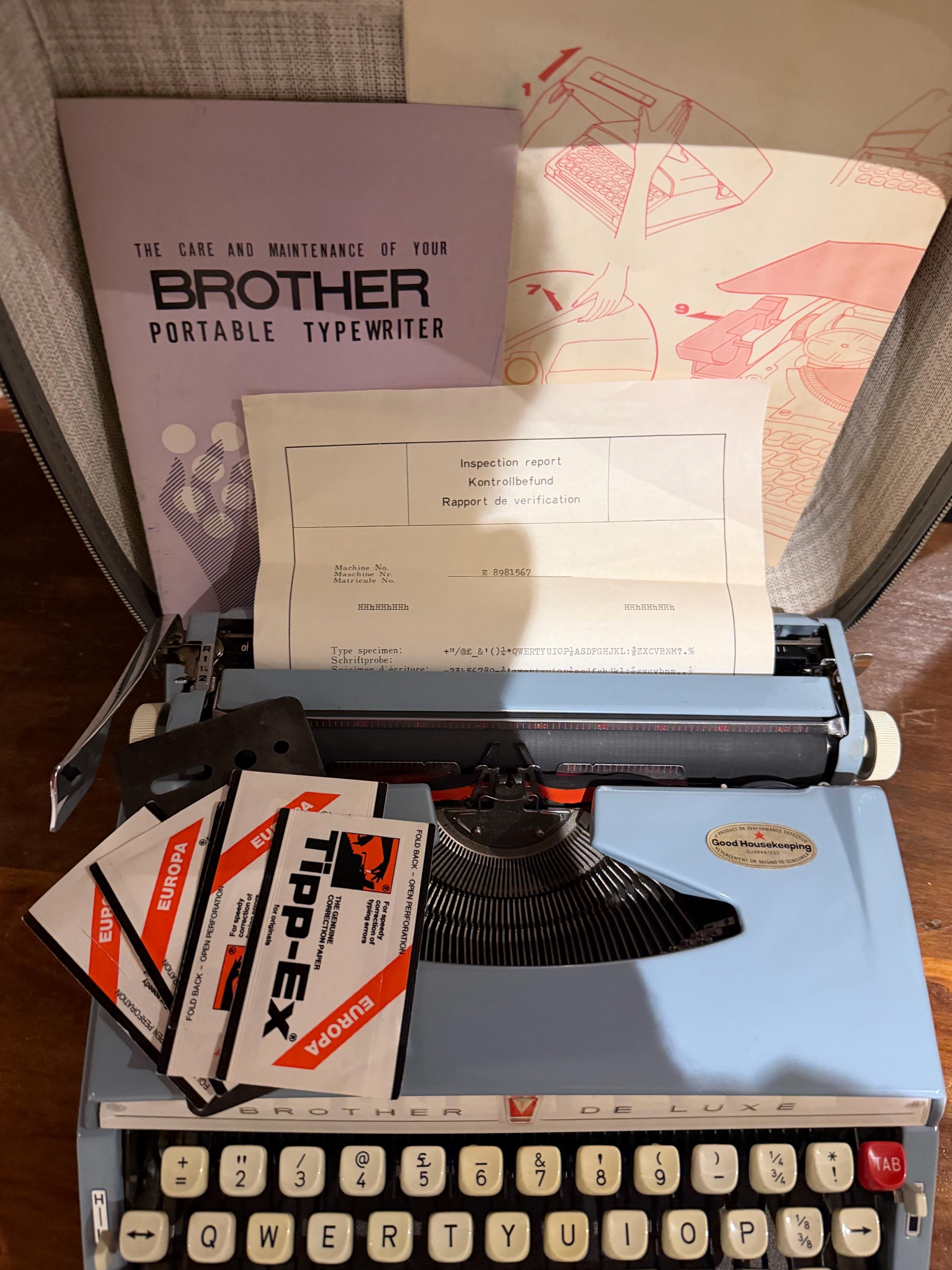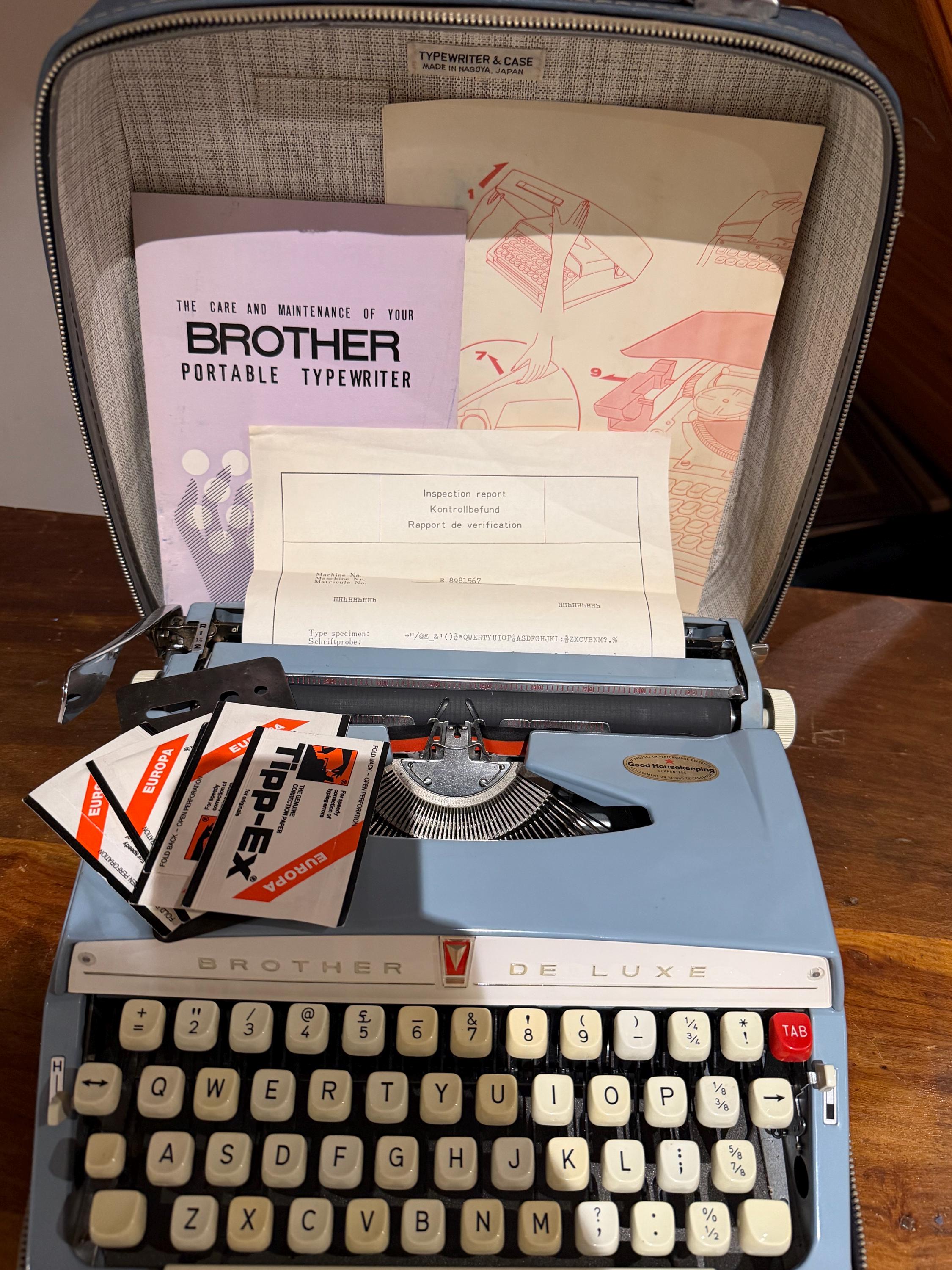 The Ultimate Writer’s Time Capsule: 1968 Brother De Luxe This is an exceptional example of the classic Brother De Luxe portable typewriter in its most iconic powder blue finish. This machine isn't just a display piece; it is a fully functional, verified set with every original accessory a collector could want. • Mechanical Condition: Fully working with smooth key action and carriage return. The signature Red TAB button is present and fully operational. • Original Paperwork: Includes the rare original Inspection Report (Serial No. E 8981567), the "Care and Maintenance" manual, and the original "Good Housekeeping" guarantee seal. • Complete Accessory Kit: Includes 5 vintage packs of Tipp-Ex Europa correction paper and an original plastic typing stencil. • Protective Case: Comes with the original zip-up carrying case. Note: The case opens freely, but there is a small tear near the zipper as shown in the photos. • Provenance: Made in Nagoya, Japan, in May 1968.