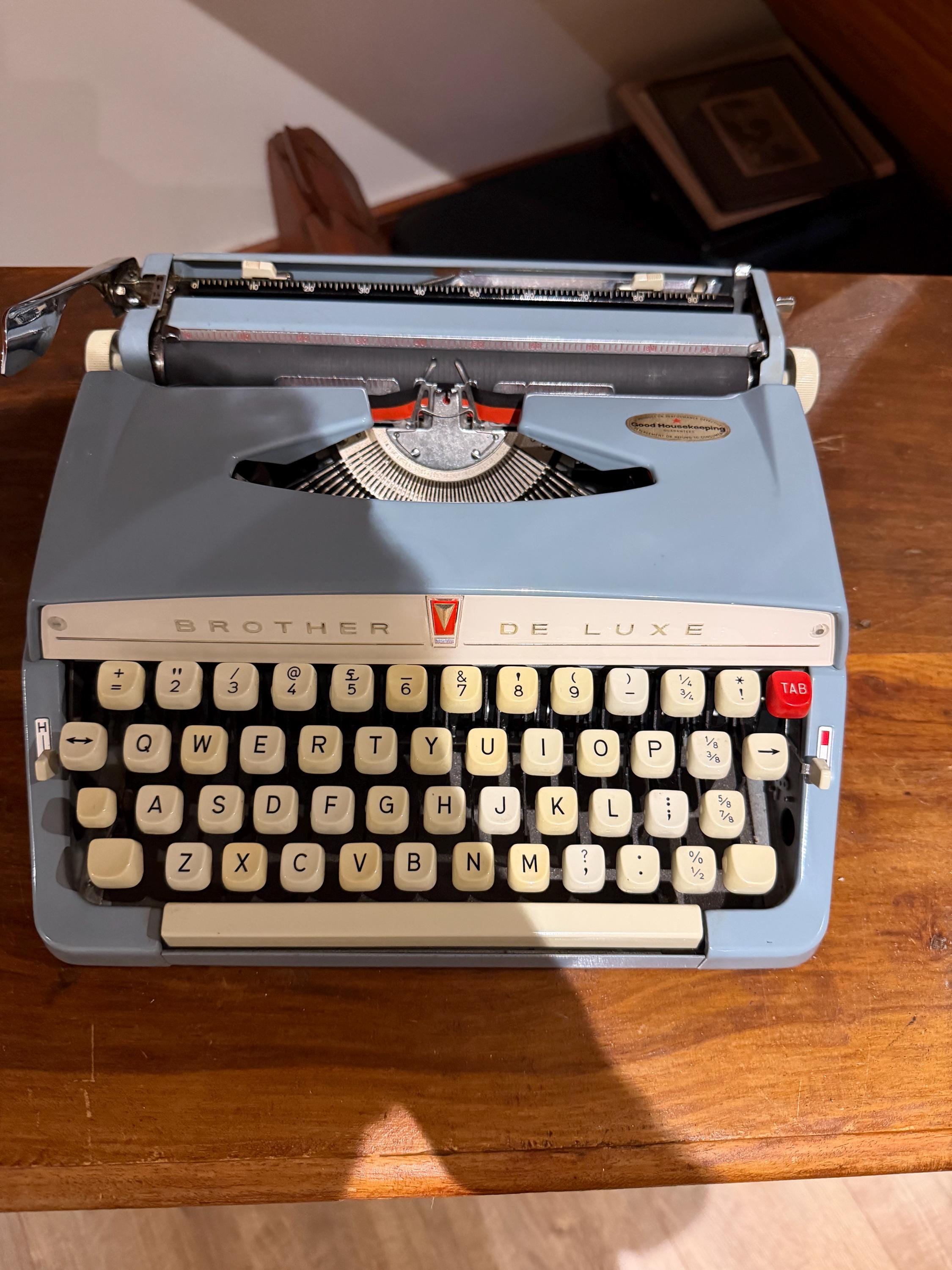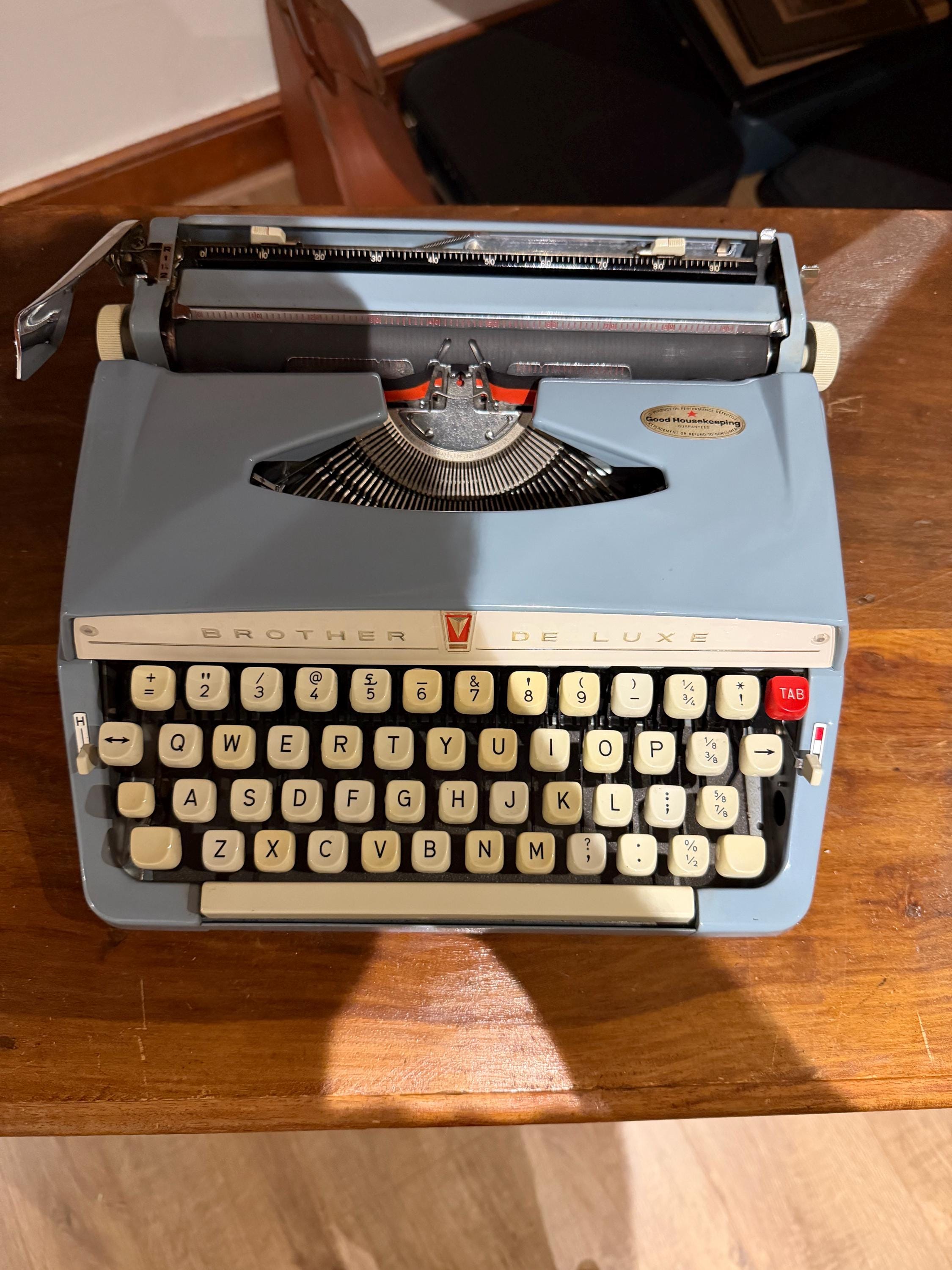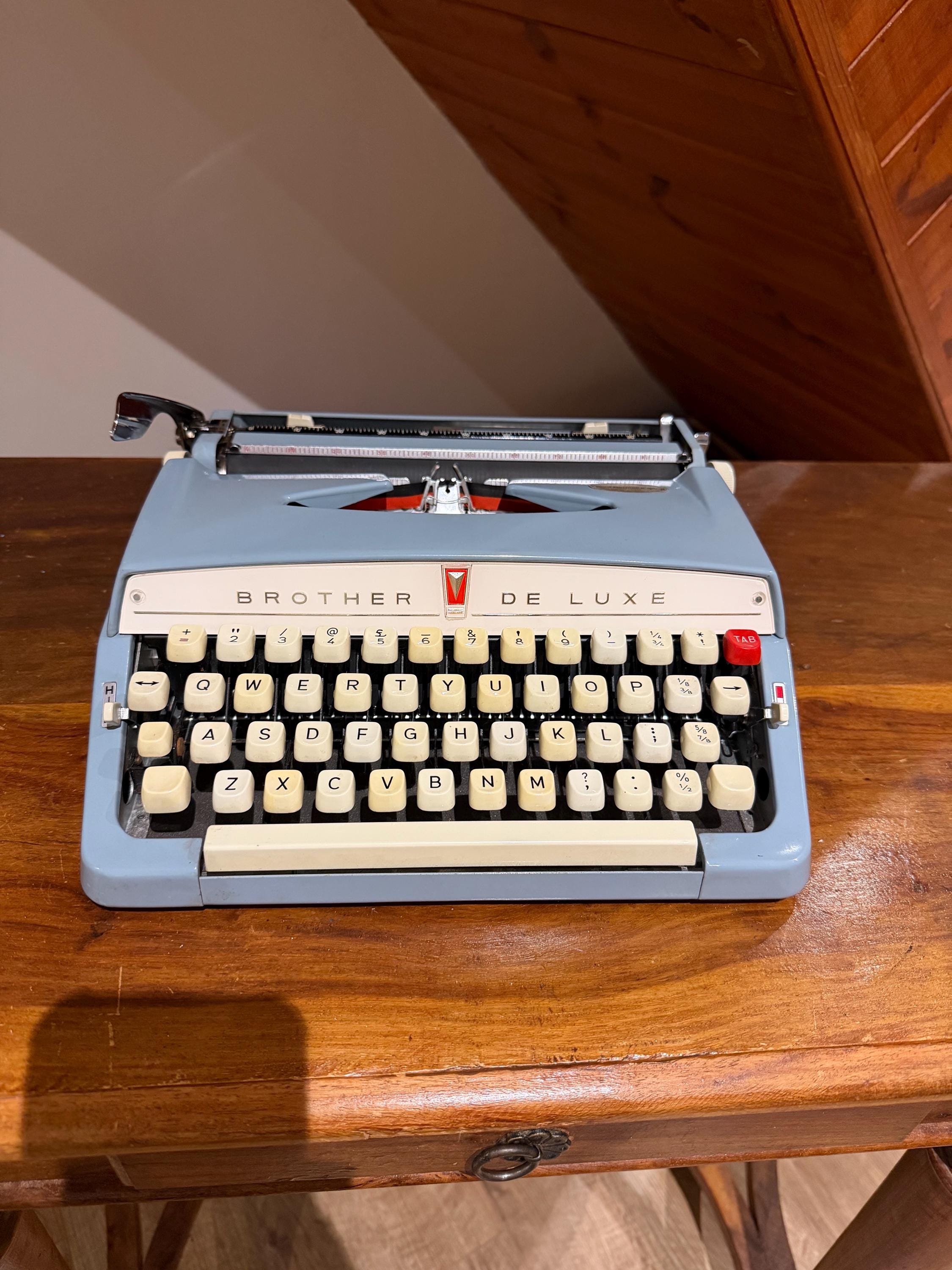The Ultimate Writer’s Time Capsule: 1968 Brother De Luxe This is an exceptional example of the classic Brother De Luxe portable typewriter in its most iconic powder blue finish. This machine isn't just a display piece; it is a fully functional, verified set with every original accessory a collector could want. • Mechanical Condition: Fully working with smooth key action and carriage return. The signature Red TAB button is present and fully operational. • Original Paperwork: Includes the rare original Inspection Report (Serial No. E 8981567), the "Care and Maintenance" manual, and the original "Good Housekeeping" guarantee seal. • Complete Accessory Kit: Includes 5 vintage packs of Tipp-Ex Europa correction paper and an original plastic typing stencil. • Protective Case: Comes with the original zip-up carrying case. Note: The case opens freely, but there is a small tear near the zipper as shown in the photos. • Provenance: Made in Nagoya, Japan, in May 1968.