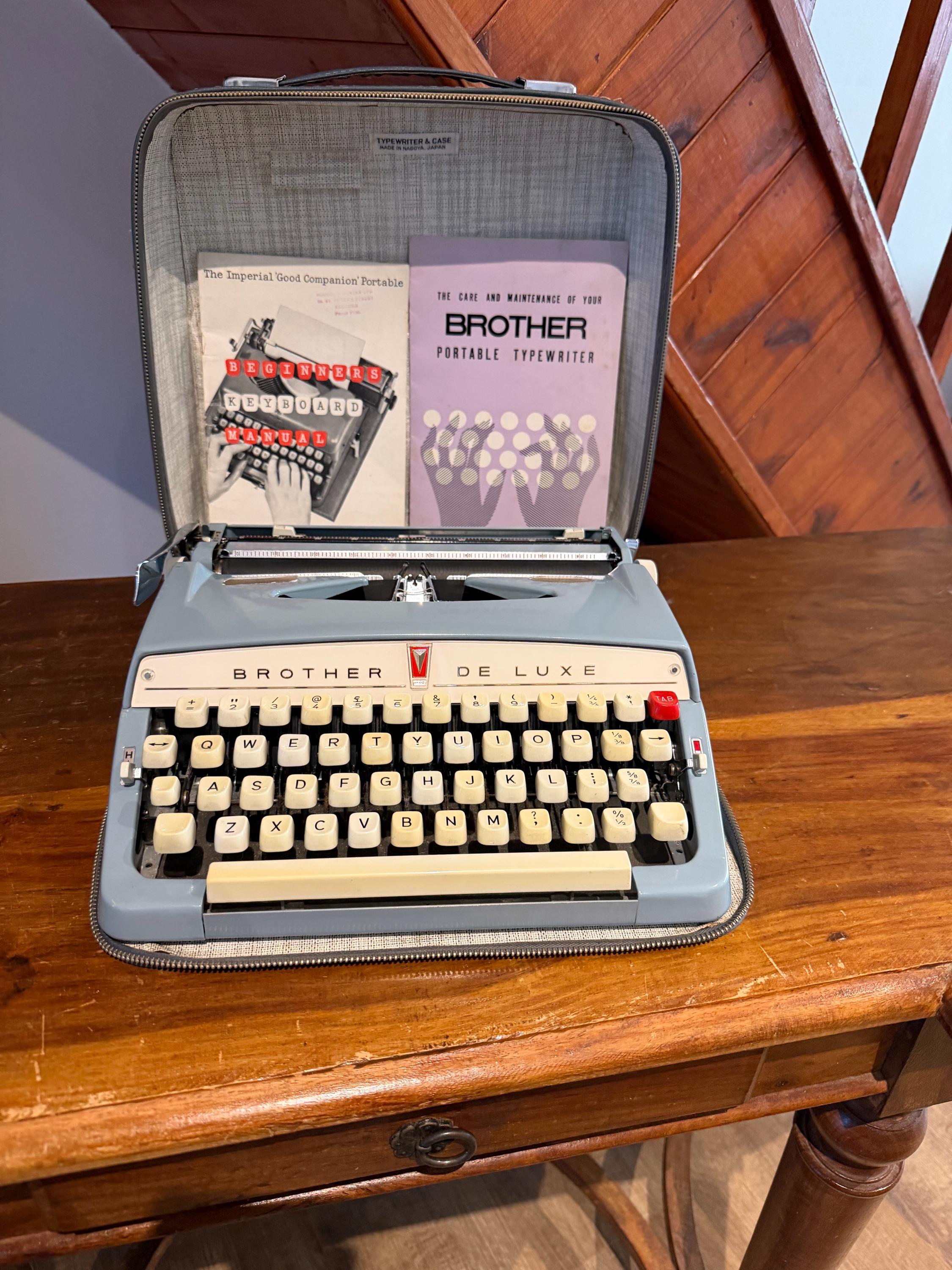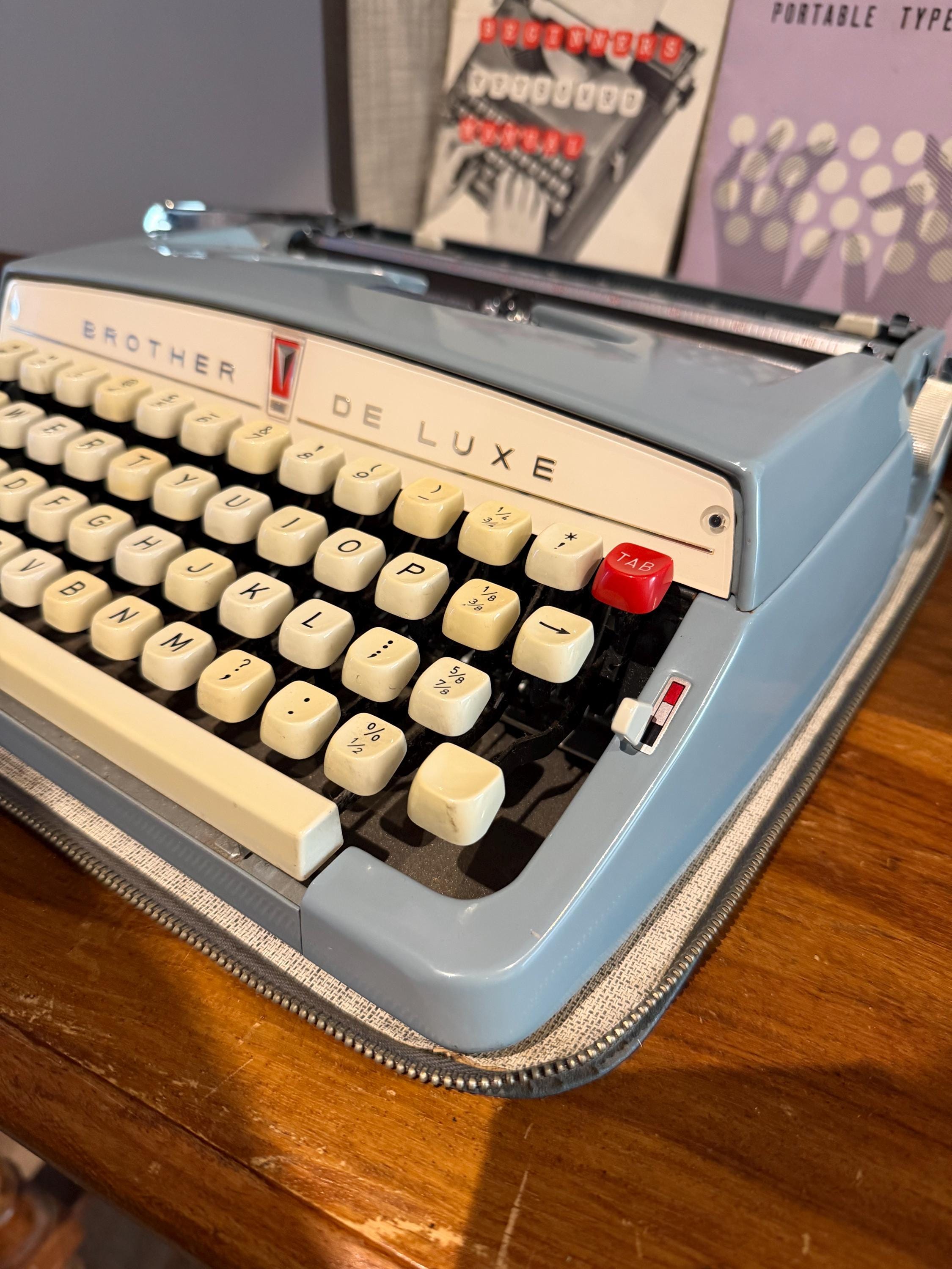 The Ultimate Mid-Century Writing Companion Step away from the screen and rediscover the tactile joy of manual typing. This stunning Brother De Luxe is a classic of Japanese engineering—compact, robust, and effortlessly stylish. Finished in a gorgeous period-correct powder blue with cream keys, it’s as much a piece of art as it is a functional tool.