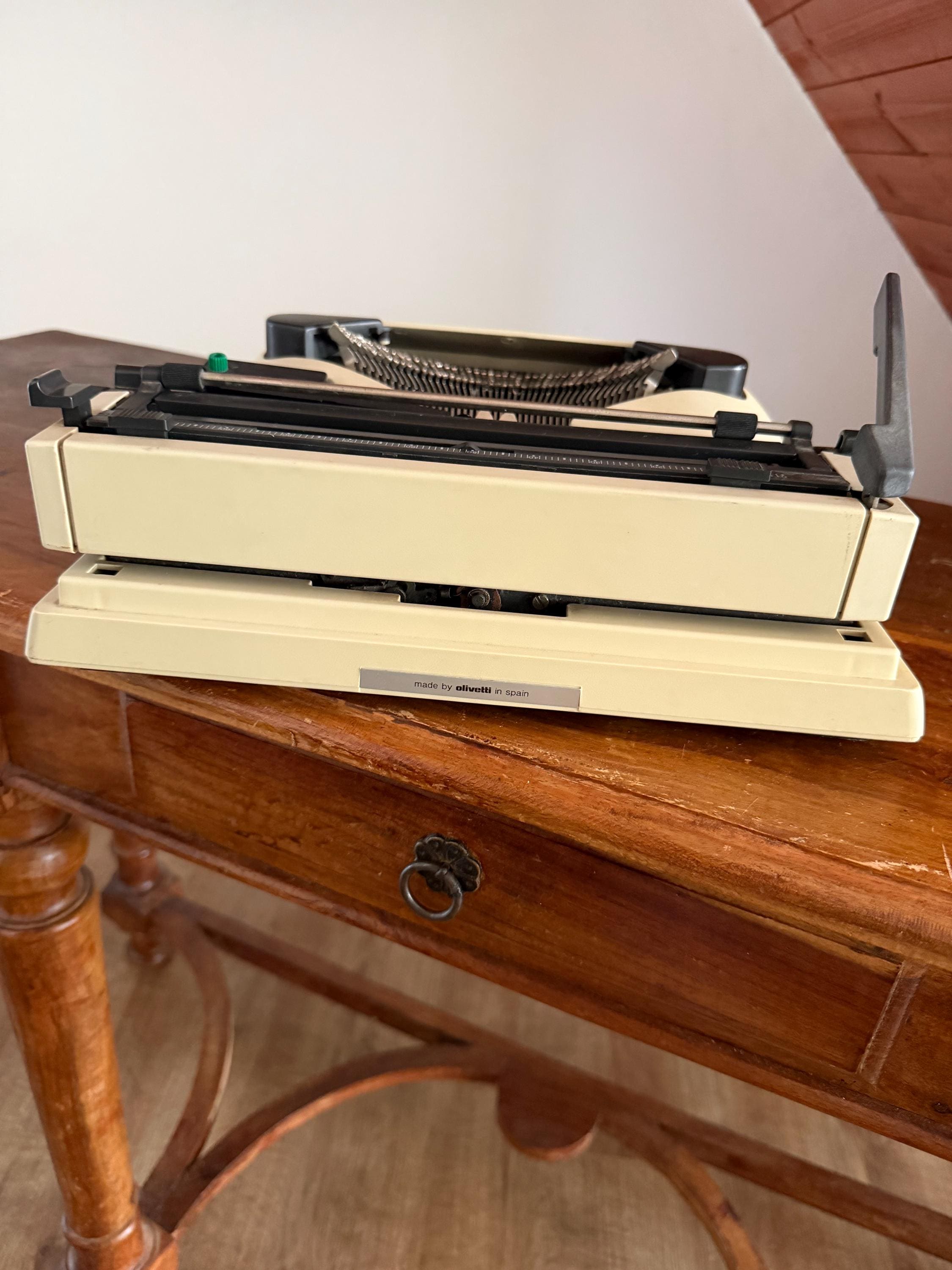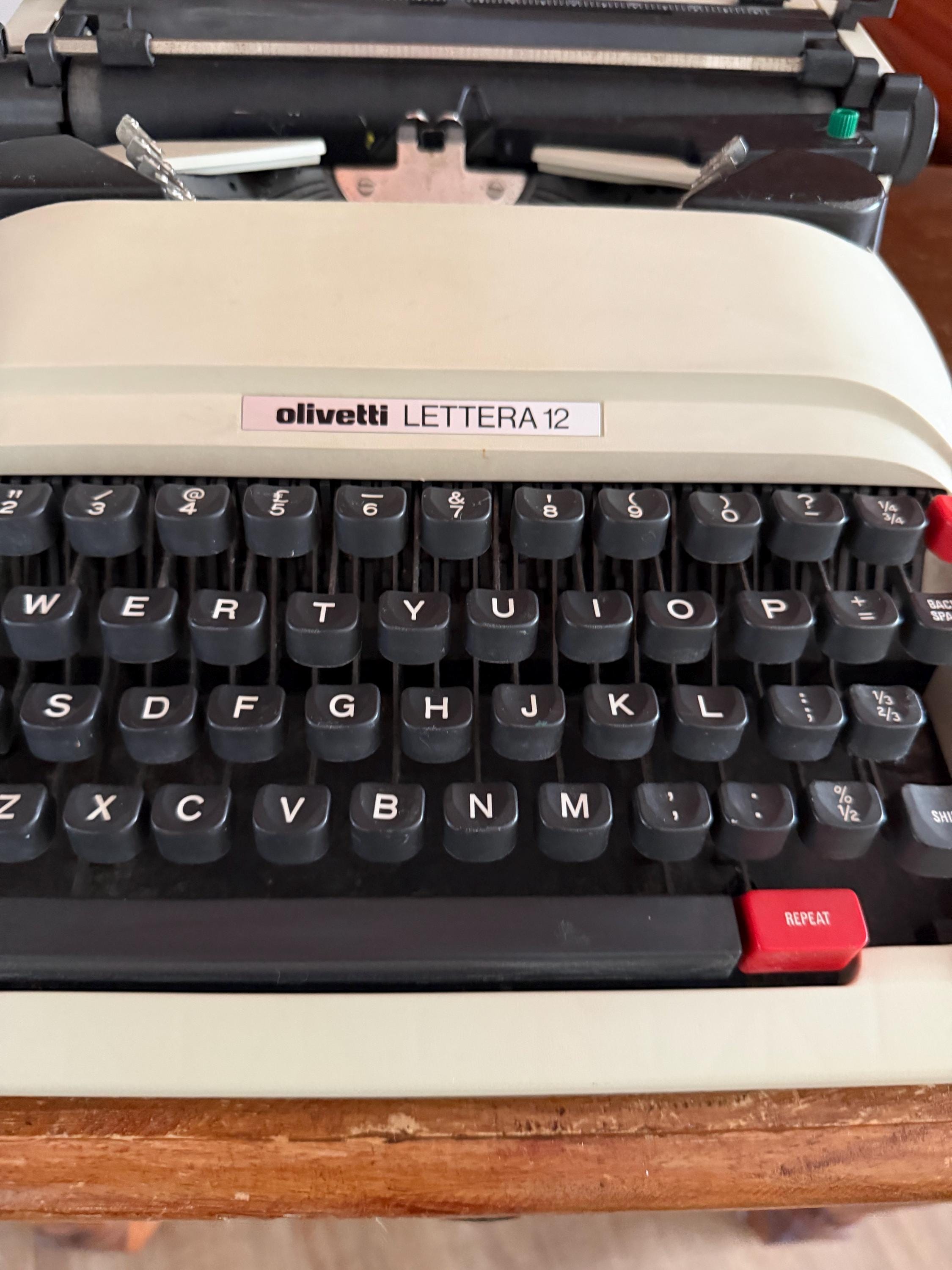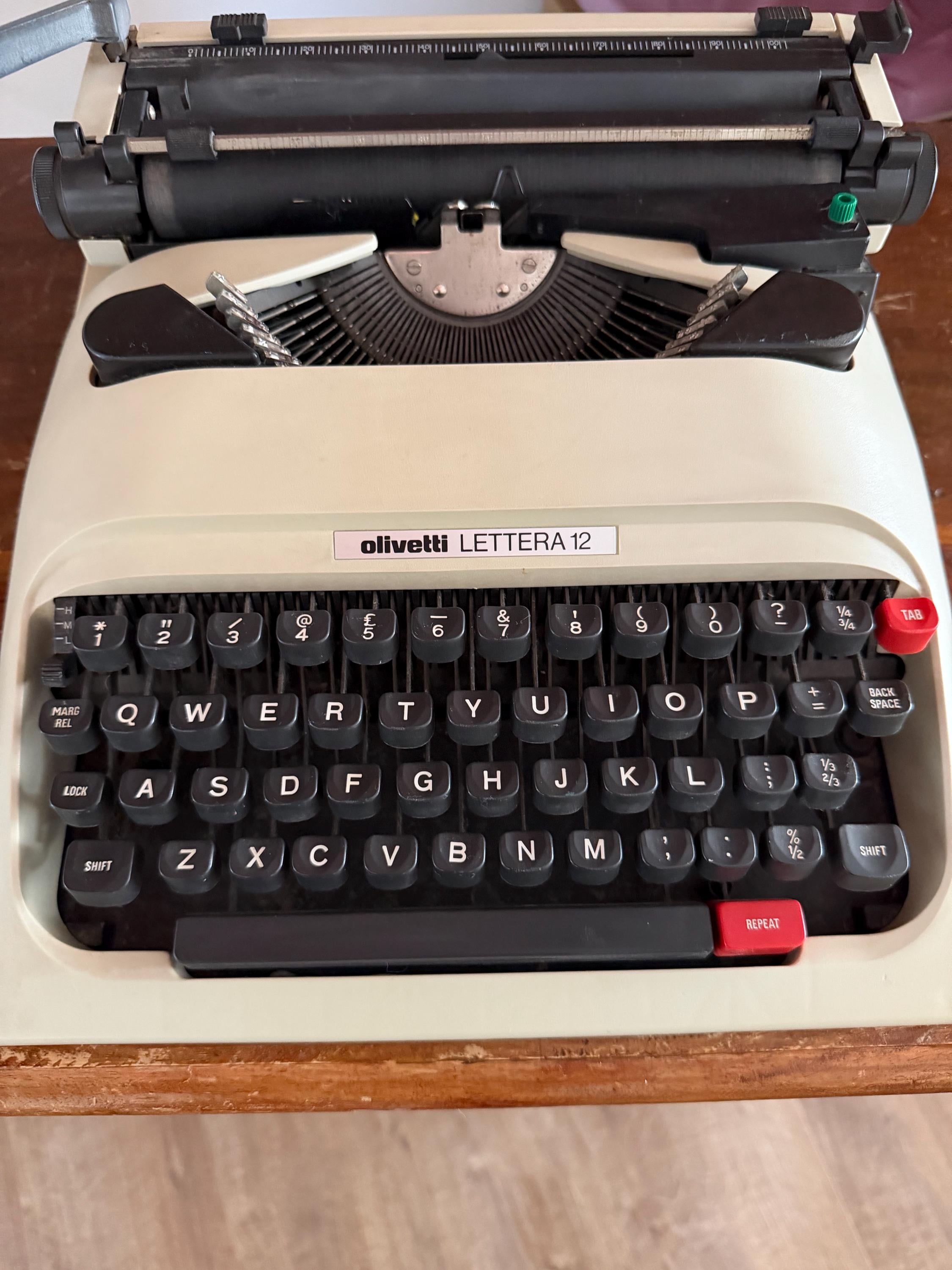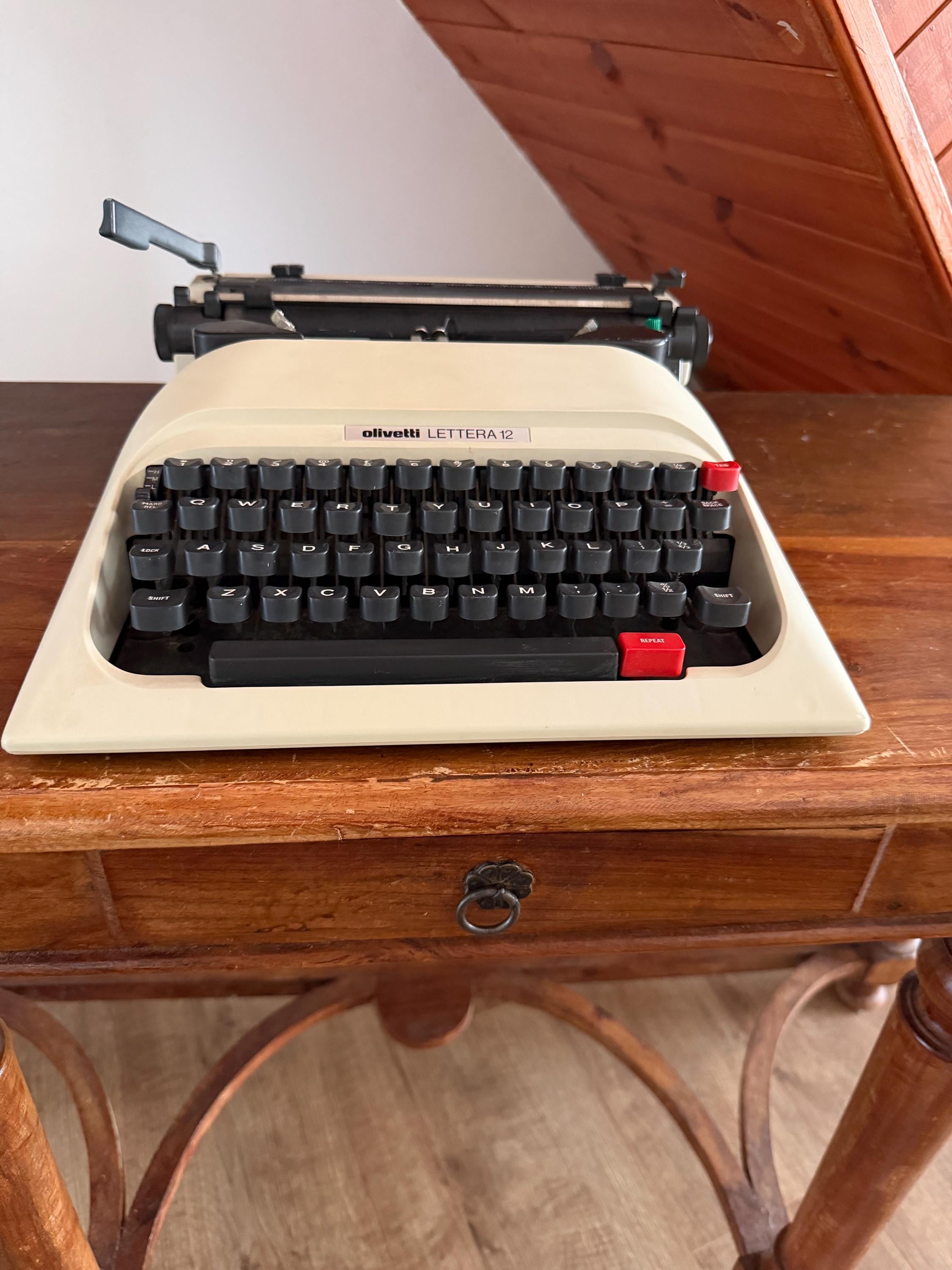• Design: Featuring the iconic "Lettera 12" branding and the signature Olivetti red tab keys. • Condition: Excellent cosmetic condition. The keys are snappy and the internal mechanism is clean and responsive. • Note: This unit is sold without a case, making it a perfect dedicated desktop machine or a stunning shelf display for a designer's studio. • Maintenance: Requires a new ribbon (standard Olivetti spools/Group 4) to be fully functional for typing.